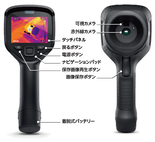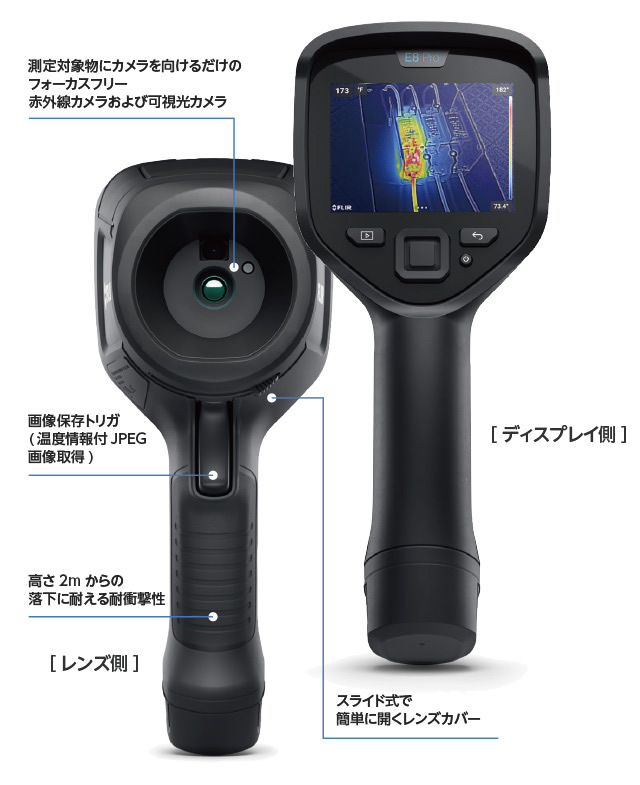| 標準装備品 | キャリングケース、バッテリー×1、 USB ケーブル、電源アダプタ、保証書 ※ FLIR E8 Proには専用充電器と予備バッテリーX1が付属 |