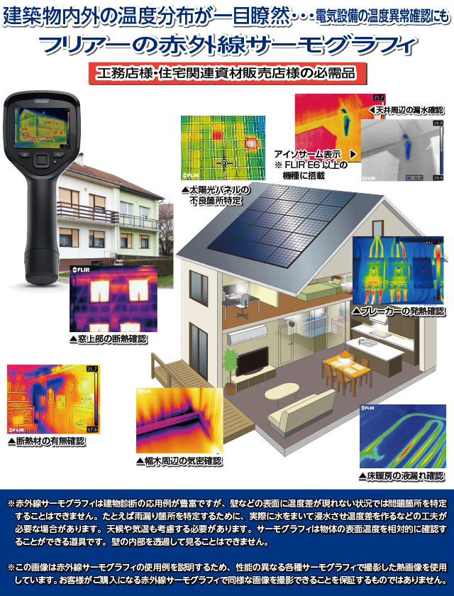 建築物内外の温度分布を可視化することにより、住宅の機密性、遮熱性、断熱材の効果確認、漏水により温度が低下した壁面の確認などに幅広く使われています。また電気設備や太陽光パネルの発熱箇所の特定など、設備メンテナンスにも使用されています。