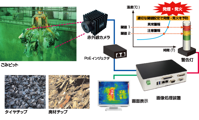 廃棄物の表面温度を常時監視し、発火する前に閾値温度をキャッチ