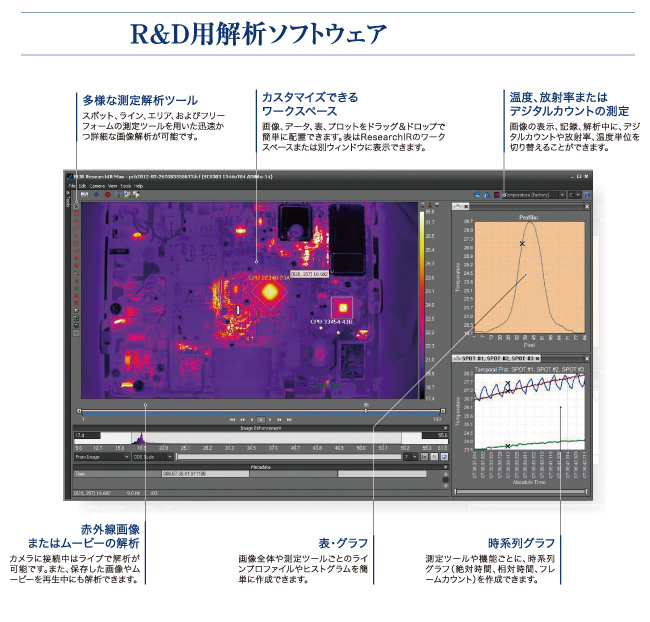 研究開発や品質保証などにおける温度変化など、高度な動画解析を必要とされるお客様に適したR&Dモデルです。