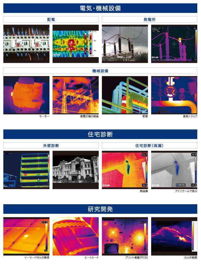ハイスペックで細部まで鮮明に見える高精細画質サーモグラフィカメラは、電気・機械設備、住宅診断、研究開発など幅広い分野においてご利用いただいております。