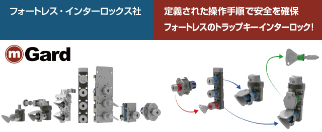 フォートレス・インターロックス社のトラップキー式インターロックスイッチ「mGard」は、予め定義された操作シーケンスが必要な安全アプリケーションで電力遮断、キー交換、およびインターロック用に設計されたメカニカル式のインターロックです。危険な機械を点検する際に作業者の安全を確保し、万が一の事故を未然に防止するための安全スイッチです。