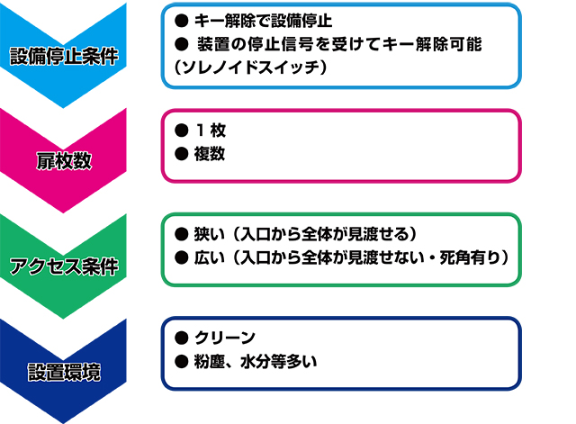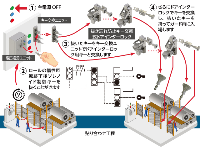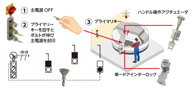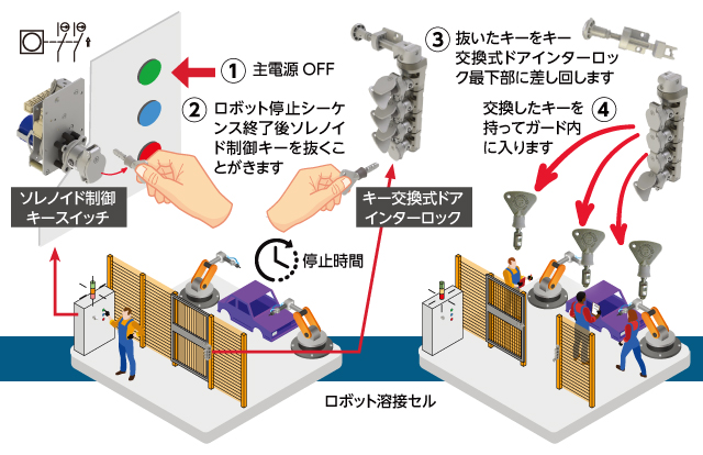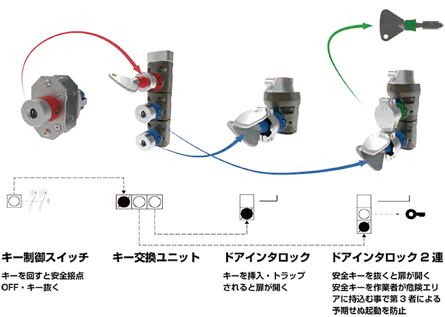 - キーは条件付けされた施錠と開錠により、安全時のみ危険エリアへの侵入を許可。