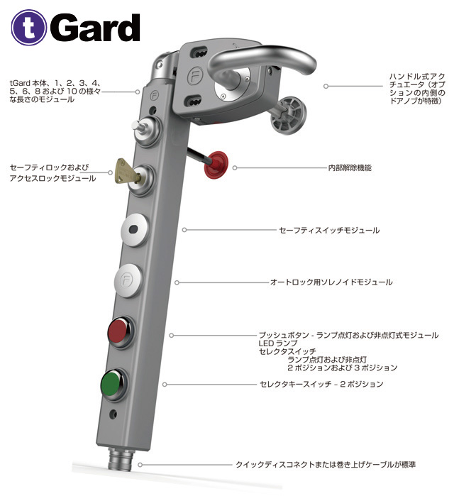フォートレス・インターロックス社のtGardは、危険が伴う機械設備へ安全に出入りできるよう確保する最先端の革新的なシステムです。コンパクトな金属製の本体に電動式セーフティゲートスイッチ(ガードロック機構の有無を問わず)、機械式トラップキー・インターロック(trapped key interlock)、オペレータ制御機構など、様々な安全装置を組み合わせることが可能です。各種安全装置を、単独で使用することも、1つの装置として統合して使用することもできます。