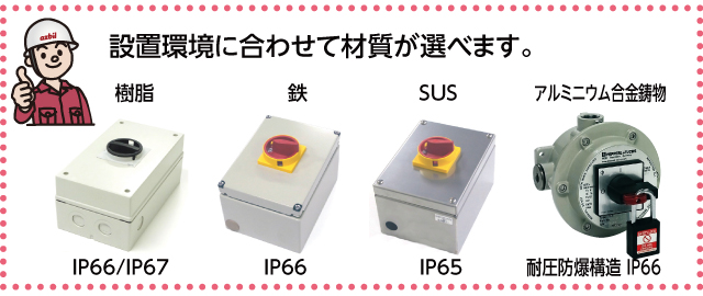- 樹脂、鉄、SUS製のボックスが選択可能(耐圧防爆構造品は、アルミニウム合金鋳物製)