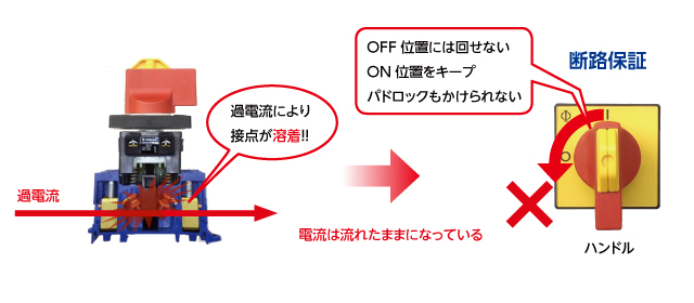 接点溶着時にハンドルを回してもOFF位置に回らない断固保証をしています。