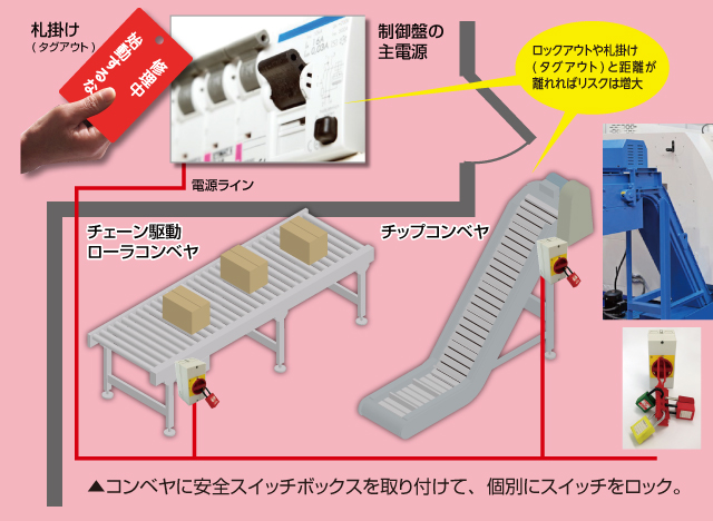 ※制御盤内の主電源をOFFにし札掛け(タグアウト)により警告表示をしても、コンベヤと距離が離れていると、第3者による予期しない再起動のリスクが増大。