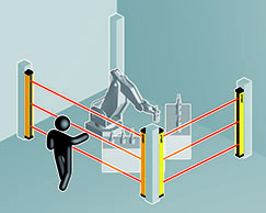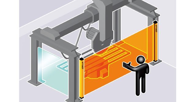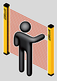 人が危険領域へ侵入した場合 | ライトカーテンを水平に展開し、限られた領域内に侵入した障害物を継続して制御して検知。ライトカーテンの分解能は、検出面の高さ(幅)によって異なるが、116mmを超えないこと。 | 機械のプッシュボタンの制御装置がある場所から見えない領域の制御が可能。 |