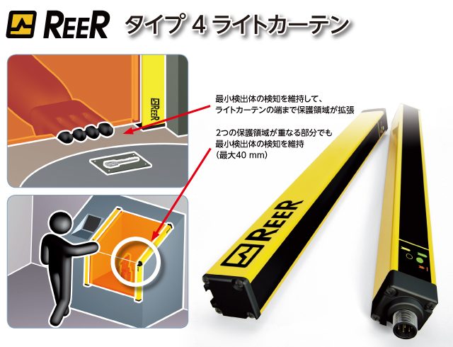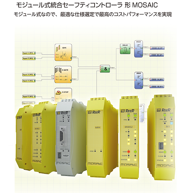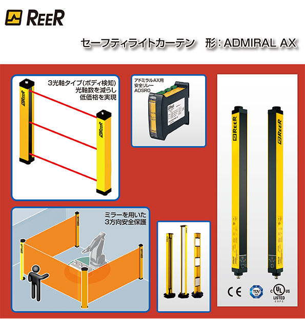 azbilグループの技術専門商社アズビルトレーディングは2011年8月よりイタリアReeR S.p.A(以下、ReeR社と略称)のセーフティライトカーテンの販売を開始しました。ReeR社のライトカーテンは国際規格IEC61496-1-2タイプ4適合。セーフティレベル:Type4-SIL3-PLe-Cat.4。ラインナップが豊富でタイプ4ライトカーテンの他、屋外環境かつ長距離(60m)で利用可能な形 JANUS-J、形 ADMIRAL AXなどお選びいただけます。形 MOSAICは、圧力・温度などアナログ値を安全入力として受ける事が可能なユニークなモジュール式安全コントローラとなり、さまざまな安全関連機器と接続可能となります。