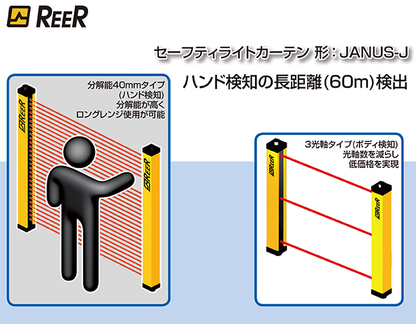 - Jロングレンジ・モデルは、検出範囲最大60mで、ボディ検知用のエリアアクセス制御には2、3、4 光軸、ハンド検出保護として最小検出体40mmの製品ご用意があります。またロングレンジモデルは反射鏡を使用して周囲の安全を保護する場合に最適です。