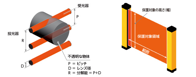 制御領域に入って、制御領域内で障害物として検知され、機械の危険な動作を停止するために必要な最小検出体が、ライトカーテンの分解能です。