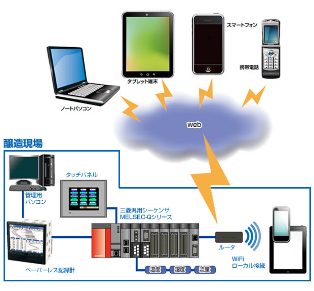 醸造パターン登録や、各種バルブ開閉の自動化、温度湿度の監視および異常事には、web 経由でスマートフォンや携帯電話にメールで通報。
