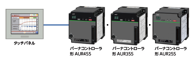 バーナーコントローラ 形AUR455/形AUR355/形AUR255と専用タッチパネルを繋げることで燃焼状態の見える化が実現できます。