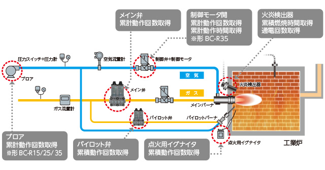 バーナコントローラに接続されている火炎検出器や自動遮断弁等の累積稼働時間および回数を記録でき、機器の寿命管理や交換周期の目安として活用できます。