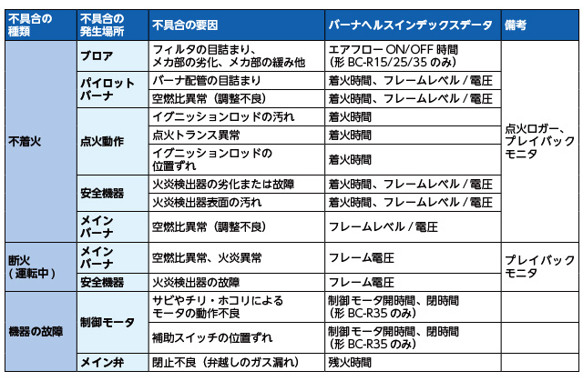 発生頻度が高い「不着火」、「断火」、「機器故障」などの原因を推測できるので、異常の予兆検出による設備の予防保全に対応できます。