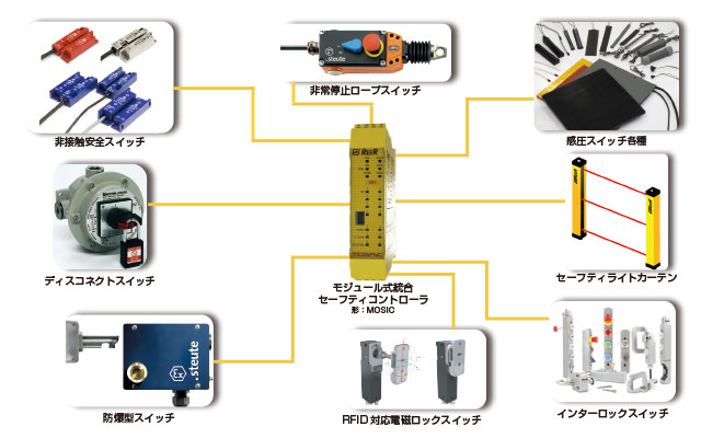 モジュール式統合セーフティコントローラ形MOSAICは、アズビルトレーディングが取り扱う機械安全関連製品(セーフティライトカーテン、感圧スイッチ各種、非常停止ロープスイッチ、防爆型スイッチ、インターロックスイッチ、RFID対応電磁ロックスイッチ、ライトカーテン、非接触安全スイッチ、ディスコネクトスイッチなど)と接続可能です。